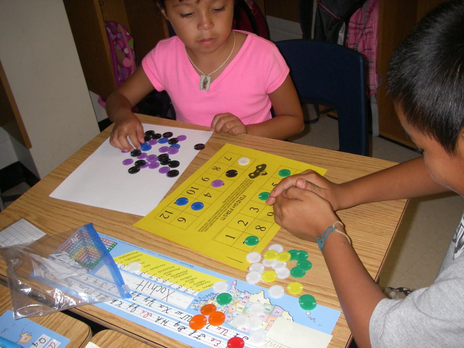 Another fun Math activity is the game Finish First. Partners share a game board where each side has 12 spaces (1-12). Each partner should have game pieces to cover up their numbers and one set of dice for the game. Partners take turns rolling the dice. They can either add, subtract, multiply, or divide to get an answer to cover up. The first time we did this, we just used addition and subtraction. The object is to cover up every number on your game board. If you rolled a 5 and a 4, you could add for a sum of 9, or you could subtract for a different of 1. They can only cover up one number though. The strategy here is to realize which numbers are harder to cover up (1's, 2's, 11, 12) since there aren't as many ways to make those numbers with the dice. The kids love this game! Here are some fun photos from the game!
